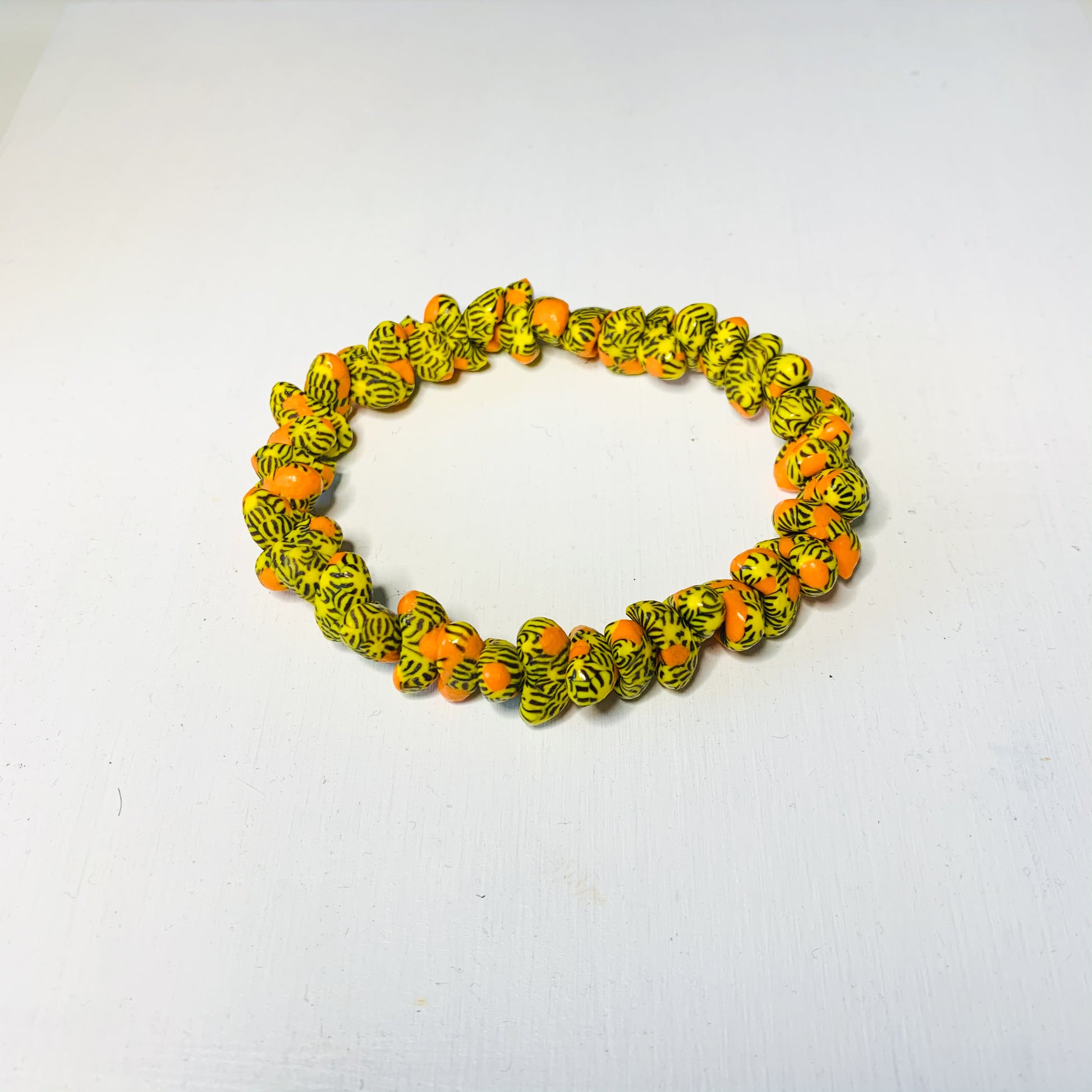 This orange, yellow and black elasticated bracelet expands to slip over your hand as you put it on, making it suitable for most wrist size. This is a great addition to your accessories collection or a really wonderful gift idea for a friend or loved one and an even better Christmas stocking filler.