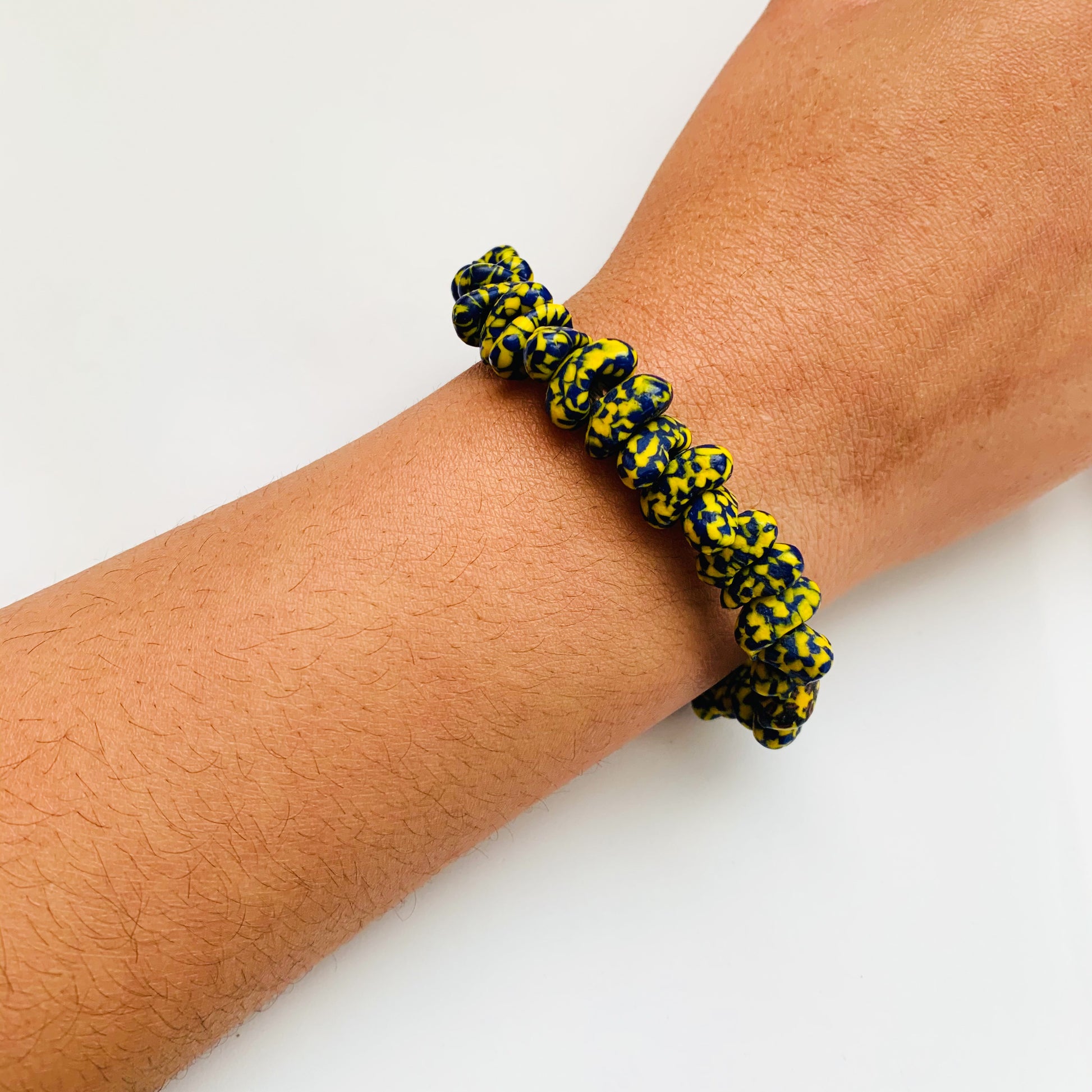 This dark blue and yellow elasticated bracelet expands to slip over your hand as you put it on, making it suitable for most wrist size. This is a great addition to your accessories collection or a really wonderful gift idea for a friend or loved one and an even better Christmas stocking filler.
