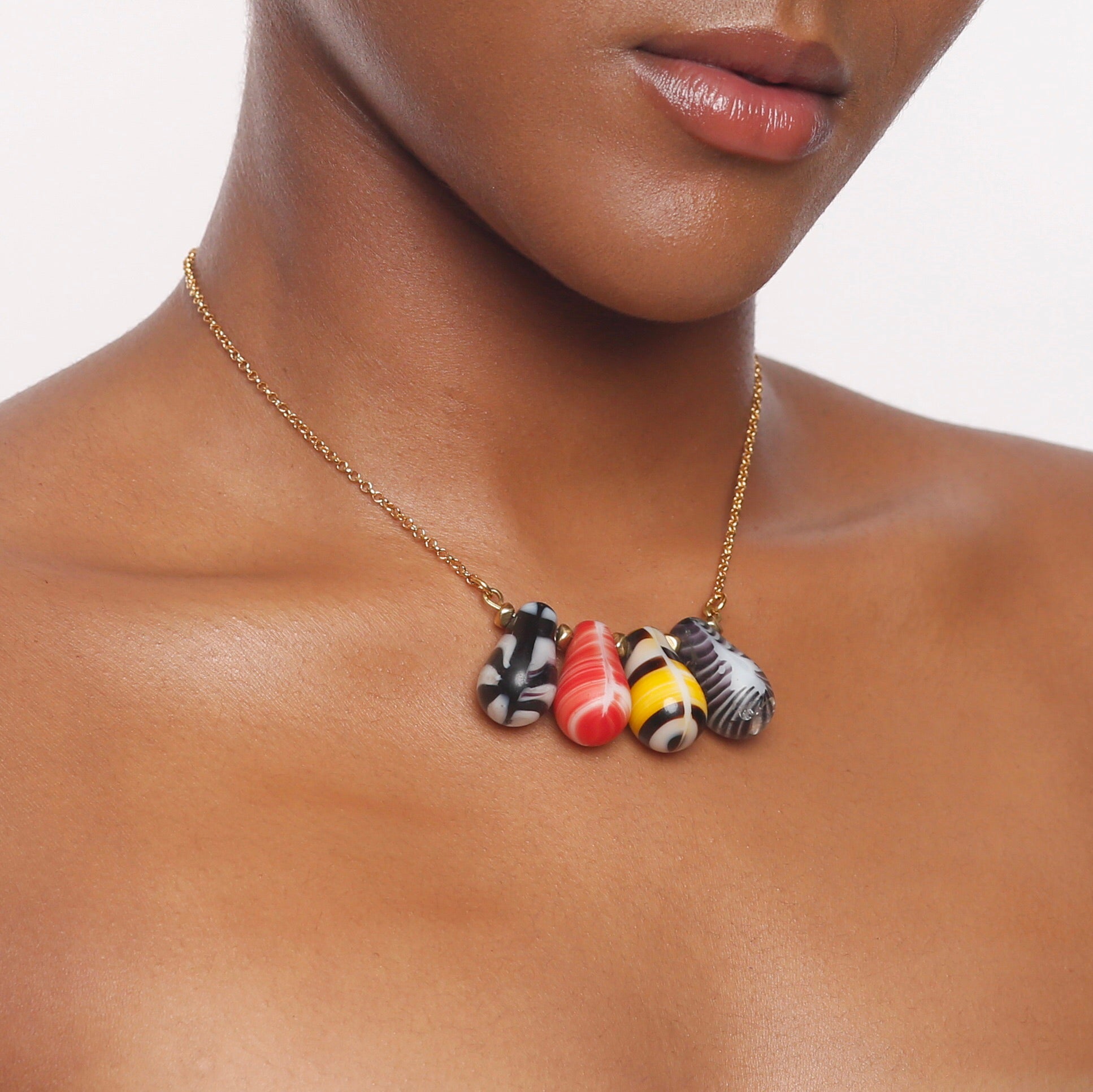 A cluster of multi coloured Mali bridal beads brought together on a fine gold necklace. These beads are vintage and cannot be reproduced exactly the same so each necklace is entirely unique, colours may vary slightly because of this. Each piece is completely unique, patterns and colours of the beads may vary.