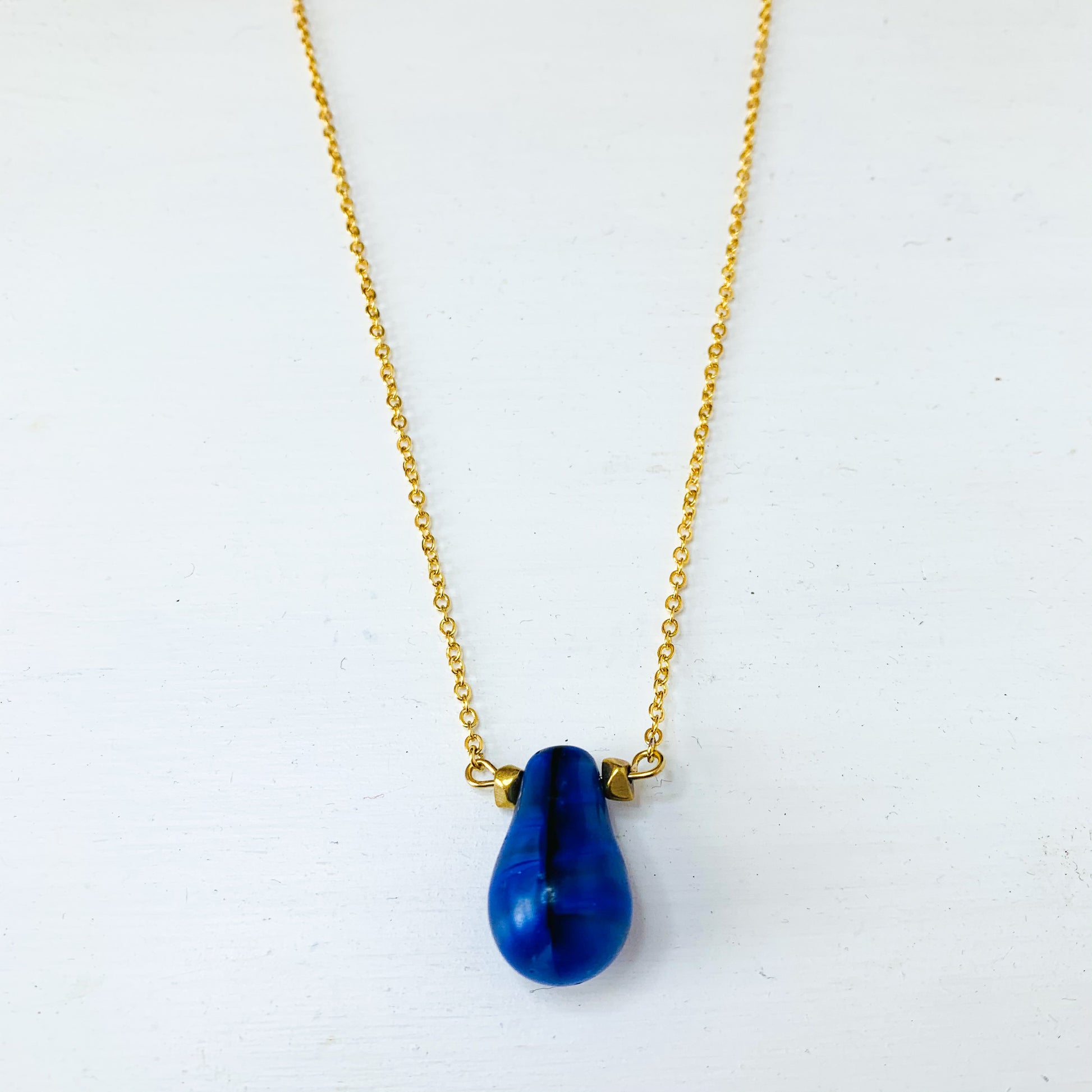 A handmade pear drop glass bead brought together with 24k gold plated fine wire and trace chain.