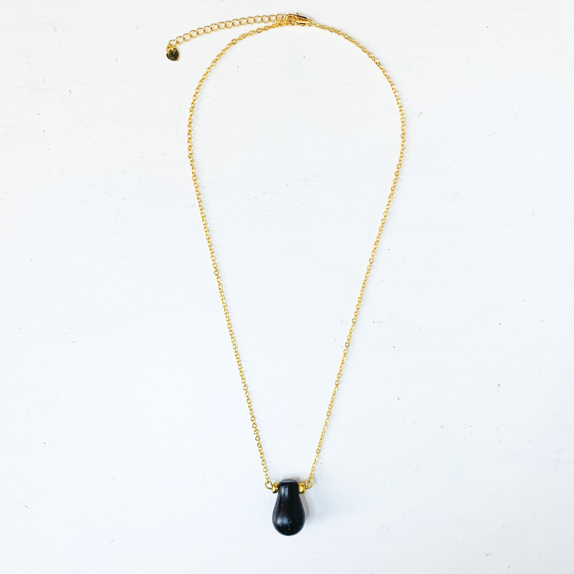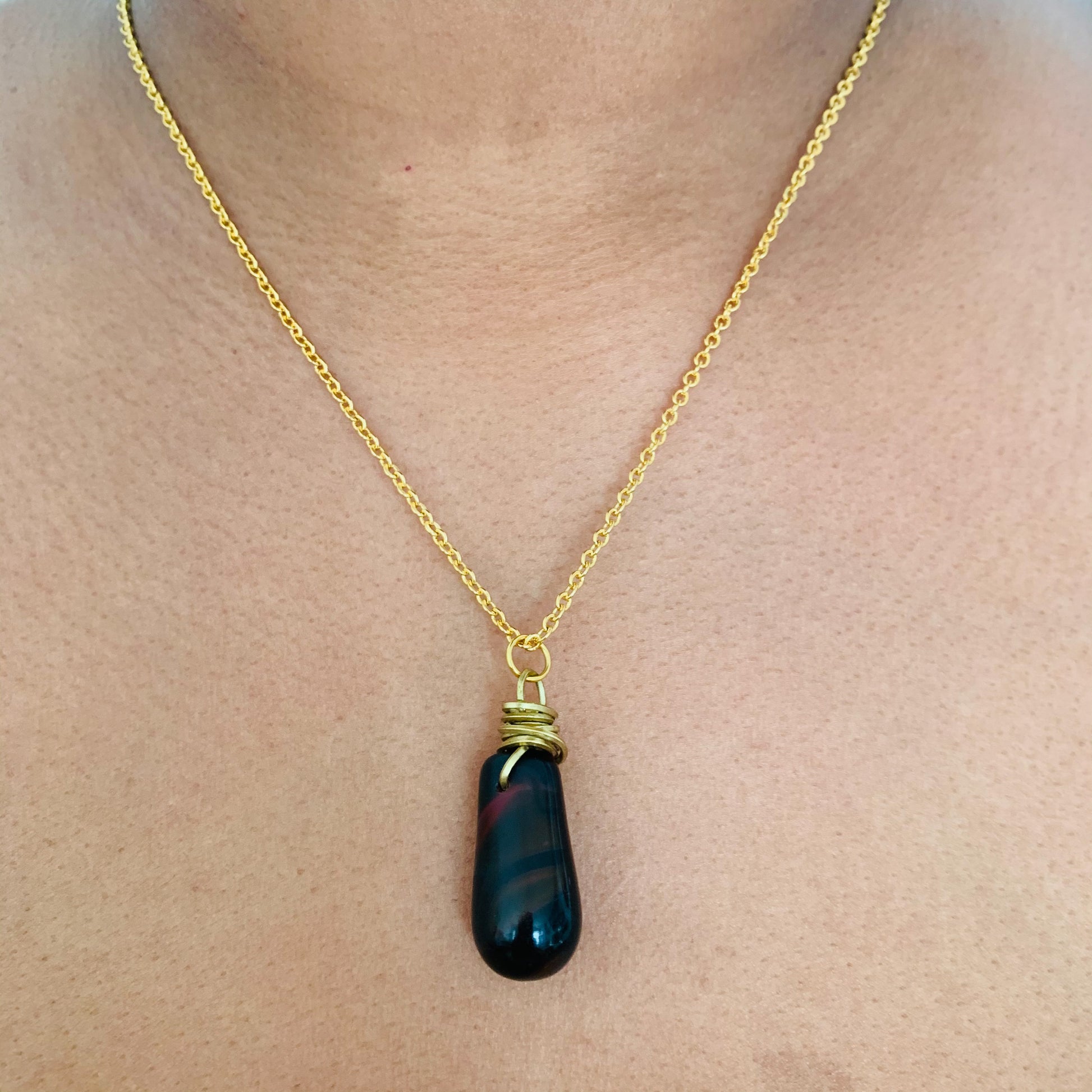 A handmade pear drop glass bead brought together with 24k gold plated fine wire and trace chain.