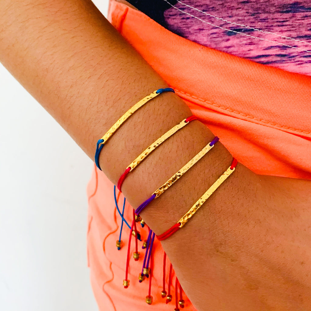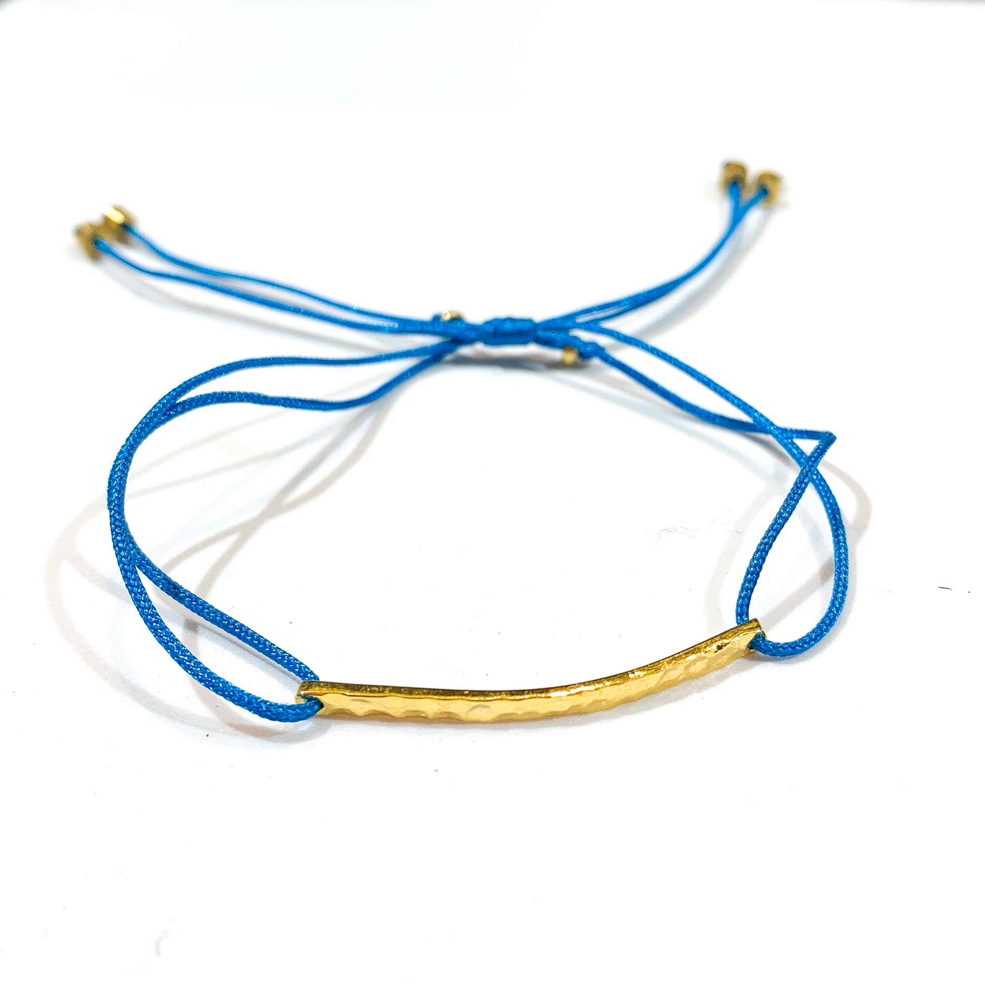 A handcrafted 24k gold plated hammered slim tag put together on a fine bright blue cord.