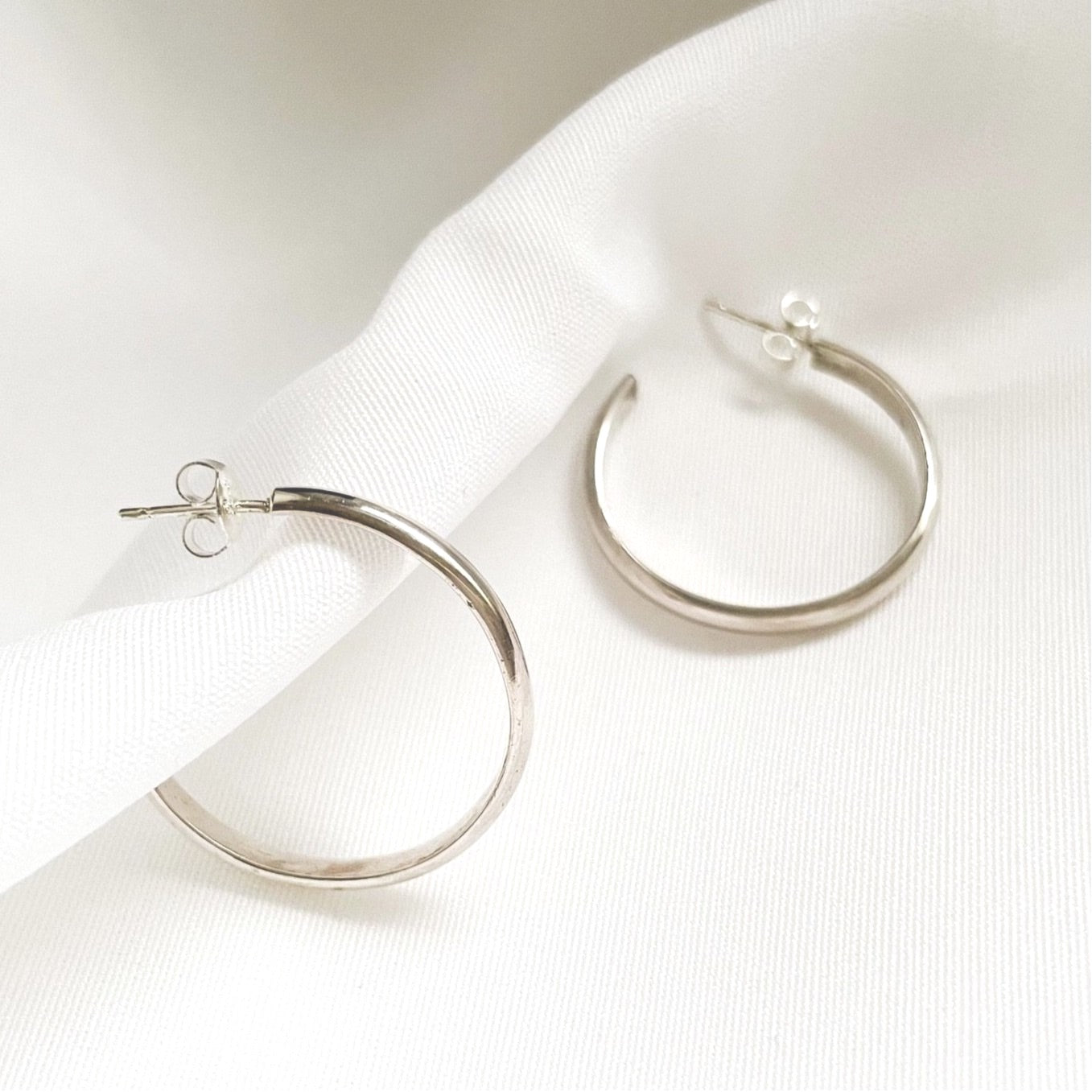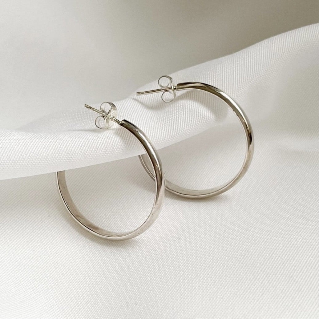 Our take on the classic hoop earrings, handmade with a d-shaped, 3mm (width) 45mm (diameter) sterling silver band. These earrings are the ultimate go to for anyone who wants to look ready, polished with a sprinkle of sparkle.