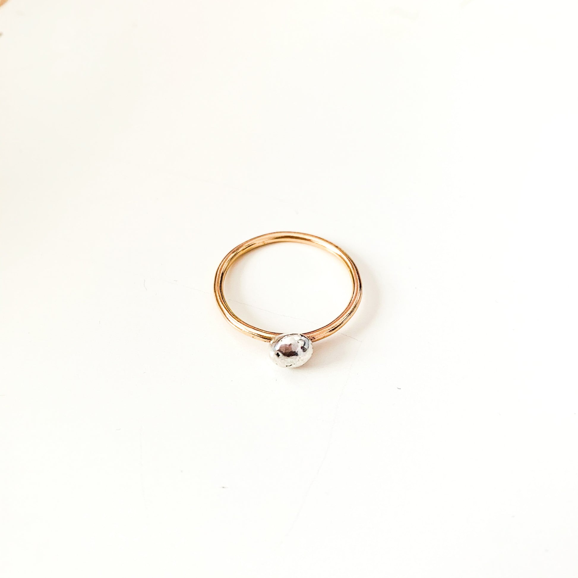 An handmade organic solid recycled silver ball soldered onto a gold filled band.
