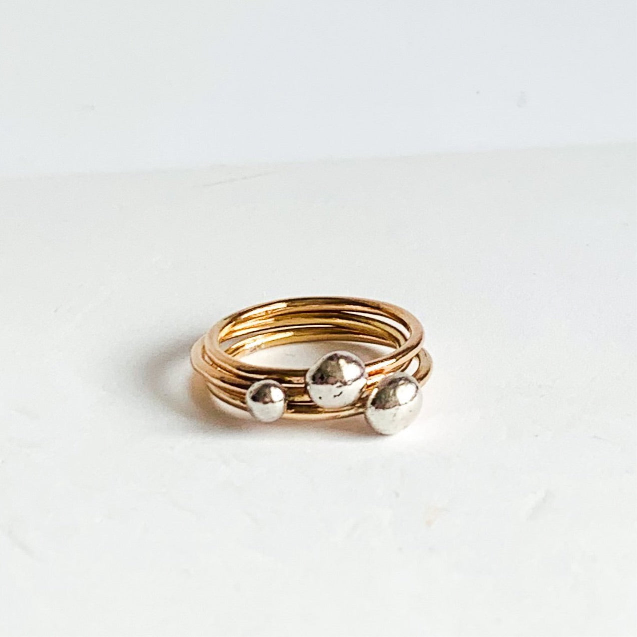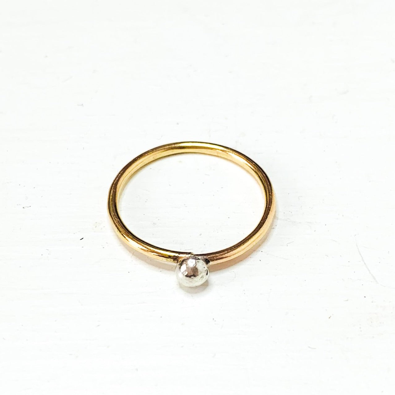 An handmade organic solid recycled silver ball soldered onto a gold filled band.